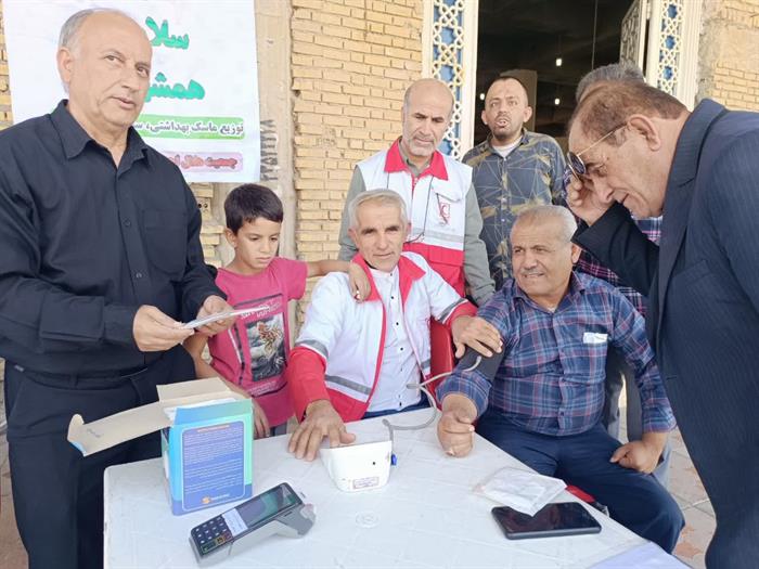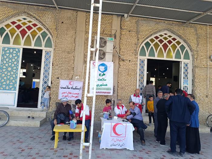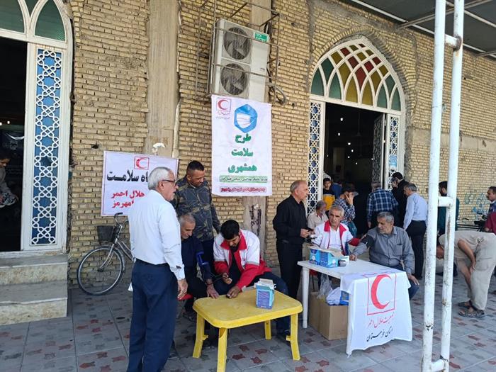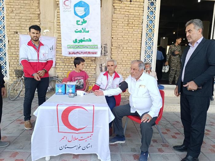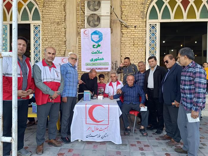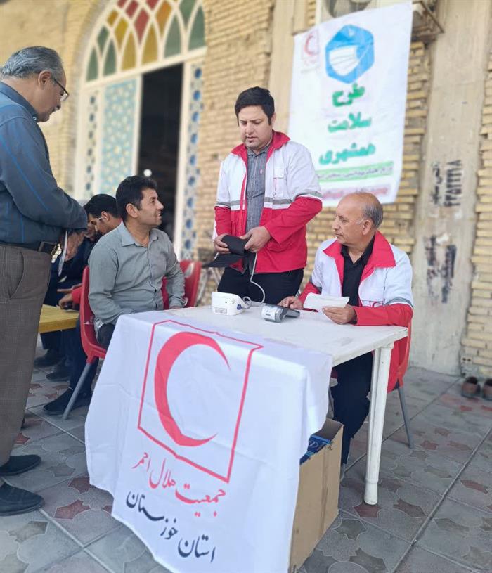 اجرای طرح«سلامت همشهری»در شهرستان رامهرمز بامشارکت اعضای داوطلب هلالاحمرواستقرارایستگاه پایش سلامت بهمنظورسنجش قندوفشارخون وتوزیع ماسک میان شهروندان