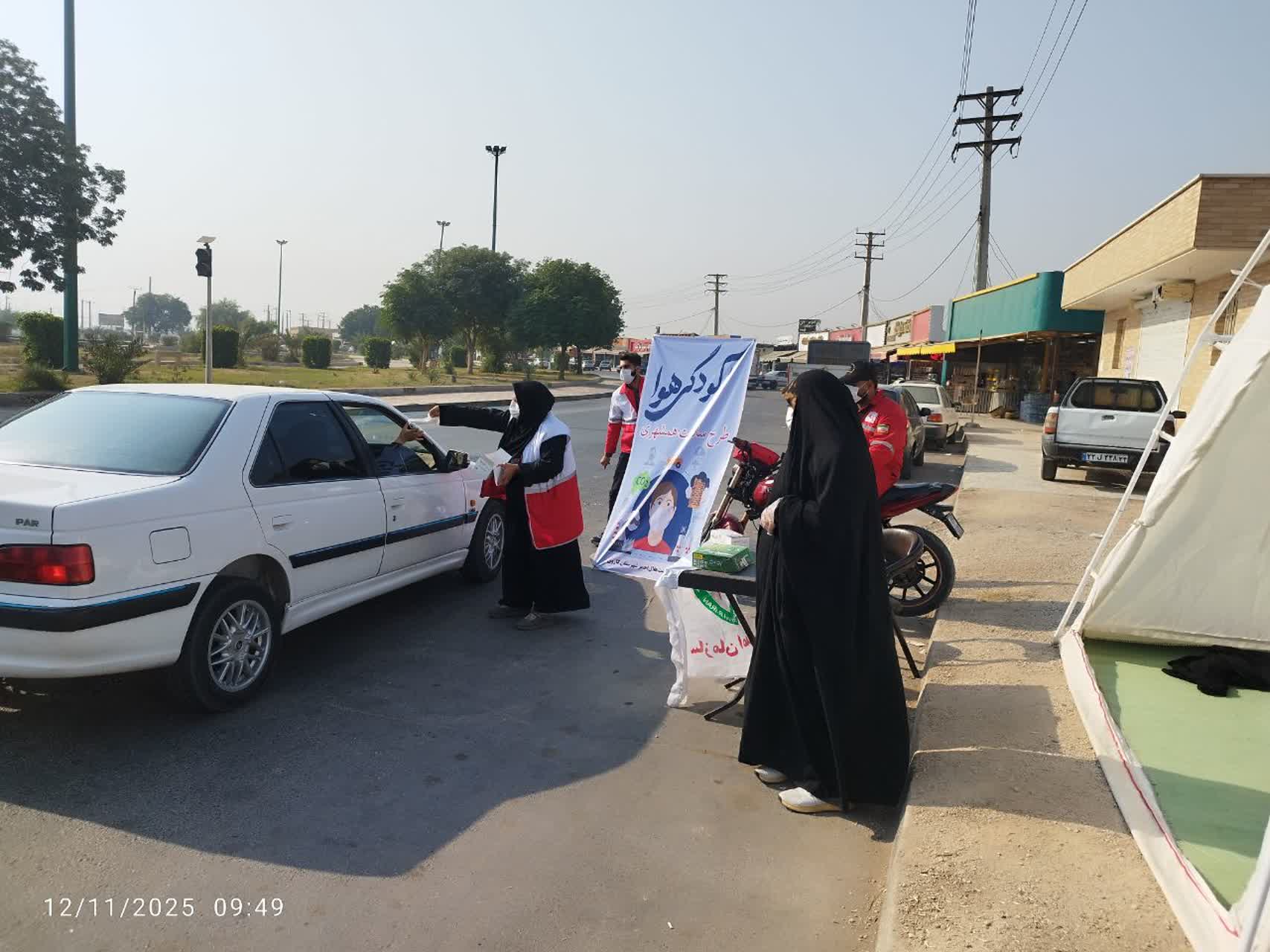اجرای طرح«سلامت همشهری»درشهرستان کارون با استقرارایستگاه پایش سلامت و مشارکت اعضای داوطلب هلالاحمر در توزیع ماسک و اندازهگیری قندوفشار خون شهروندان