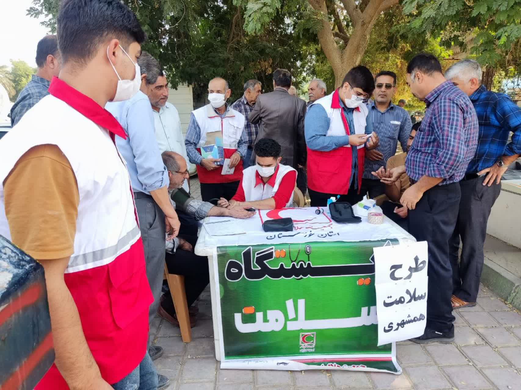 اجرای طرح«سلامت همشهری»درشهرستان شوش بامشارکت اعضای داوطلب هلالاحمرواستقرارایستگاه پایش سلامت بهمنظور سنجش قندوفشارخون وتوزیع ماسک میان شهروندان