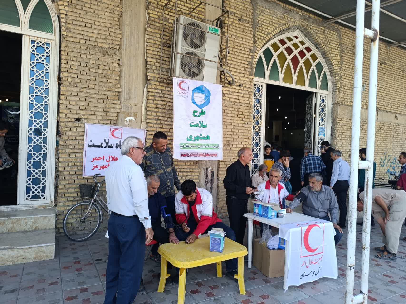اجرای طرح«سلامت همشهری»با برپایی ایستگاه پایش سلامت،توزیع ماسک و ارائه خدمات پایش قندوفشار خون توسط اعضای داوطلب جمعیت هلالاحمر شهرستان دشت آزادگان