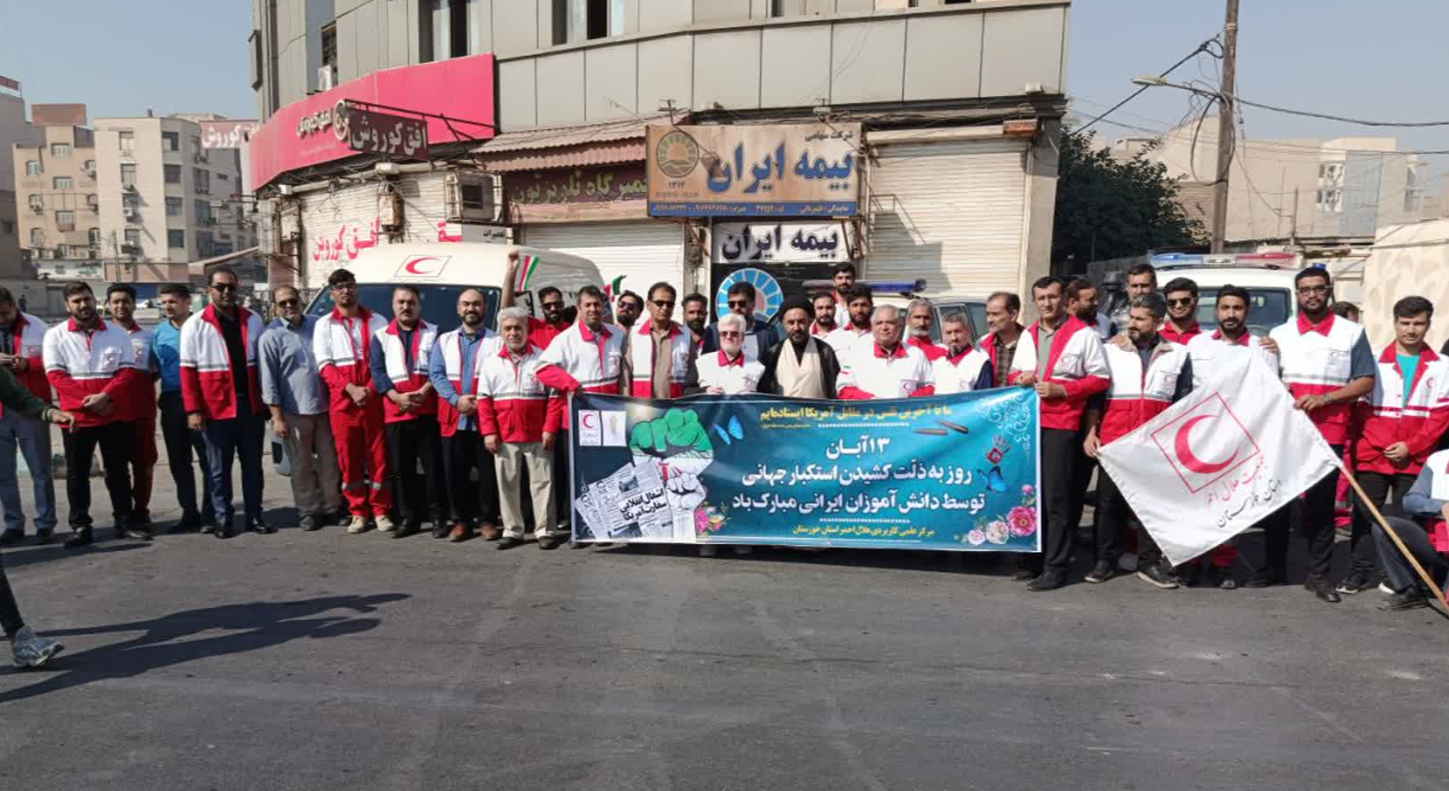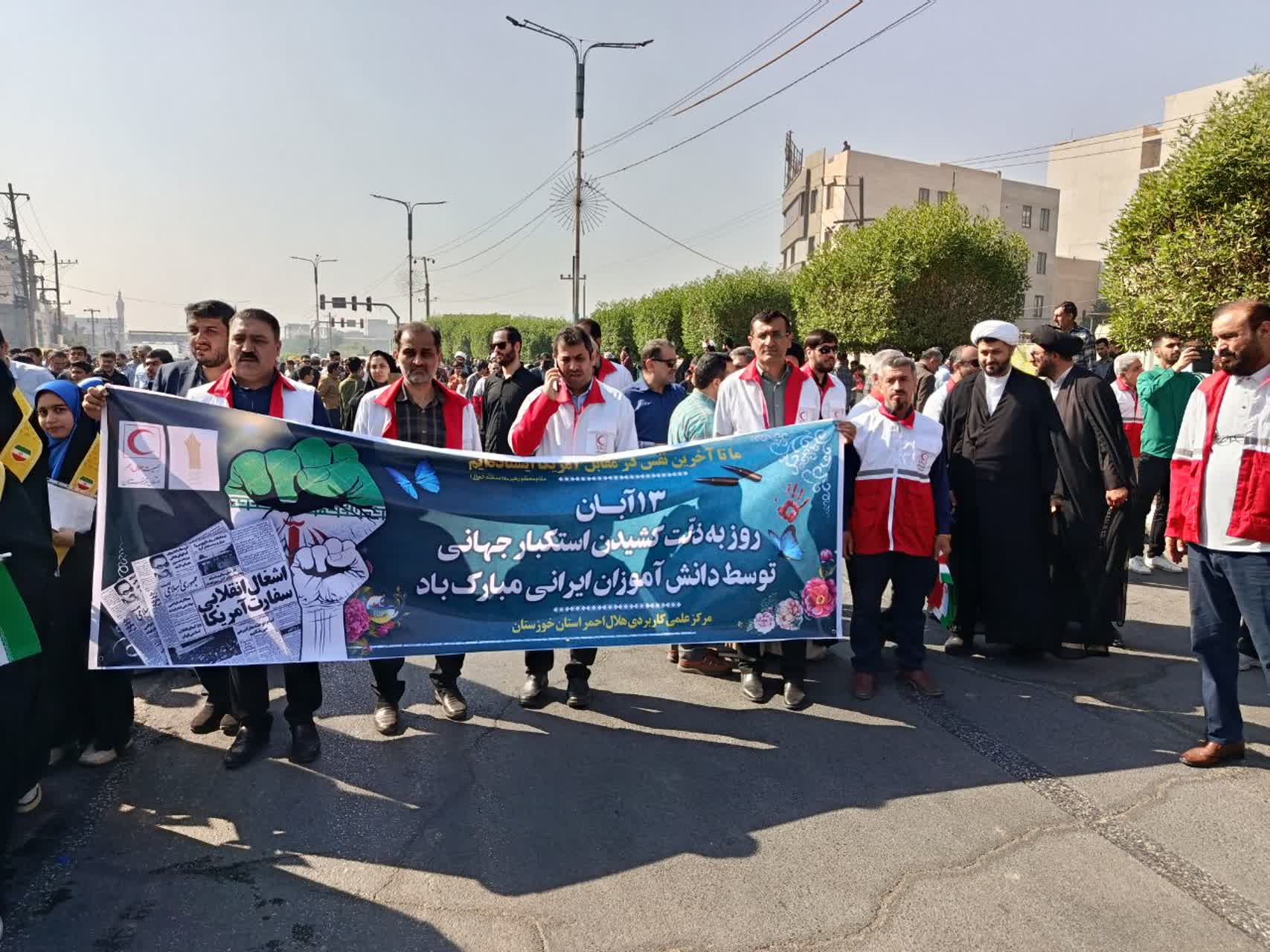 به گزارش روابط عمومی جمعیت هلال‌احمر استان خوزستان؛ به مناسبت گرامی‌داشت یوم‌الله سیزدهم آبان، روز تجلی بصیرت، آزادی‌خواهی و استکبارستیزی ملت ایران، مدیرعامل جمعیت هلال‌احمر استان خوزستان به همراه مسئول دفتر نمایندگی ولی‌فقیه در جمعیت، جمعی از معاونین، مدیران و کارکنان مرکز علمی‌کاربردی با حضوری وحدت‌آفرین و پرشور در راهپیمایی این روز بزرگ حضور یافتند.