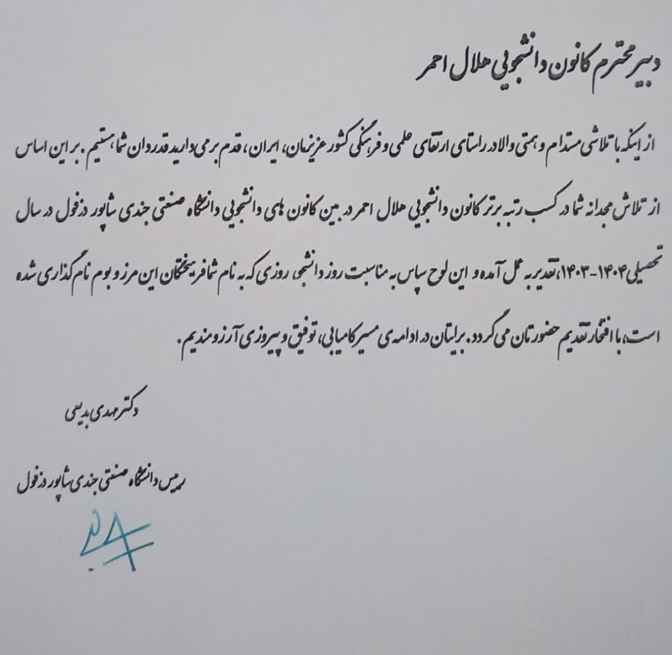 رئیس جمعیت هلال‌احمر دزفول درباره موفقیت کانون دانشجویی هلال‌احمر دانشگاه صنعتی جندی‌شاپور گفت: این موفقیت با توجه به فعالیت‌های مستمر آموزشی، فرهنگی و اجتماعی اعضا و همچنین مشارکت گسترده و مؤثر دانشجویان در طول سال تحصیلی ۱۴۰۳–۱۴۰۴ رقم خورد و کانون به‌عنوان کانون برتر سال معرفی شد.